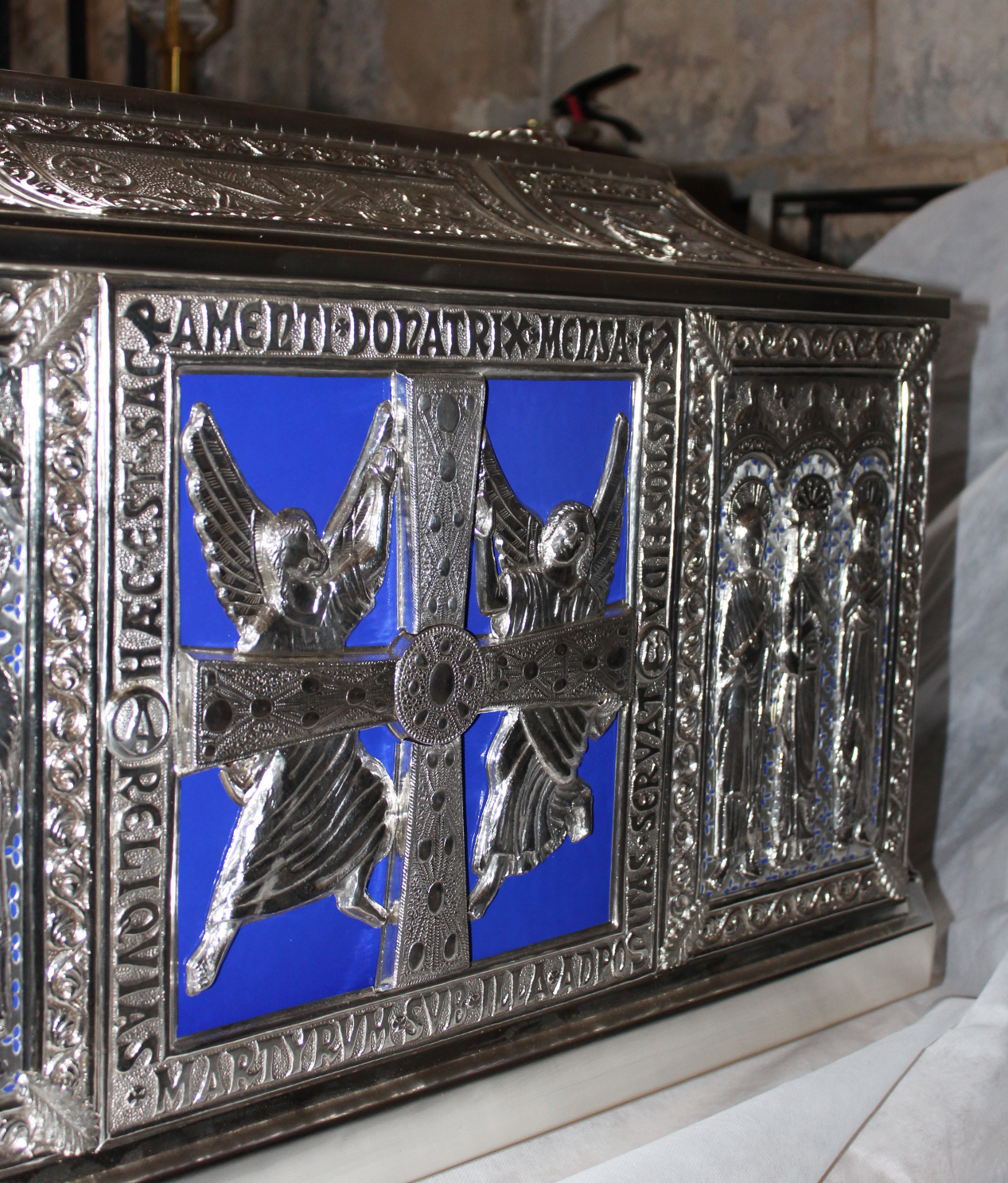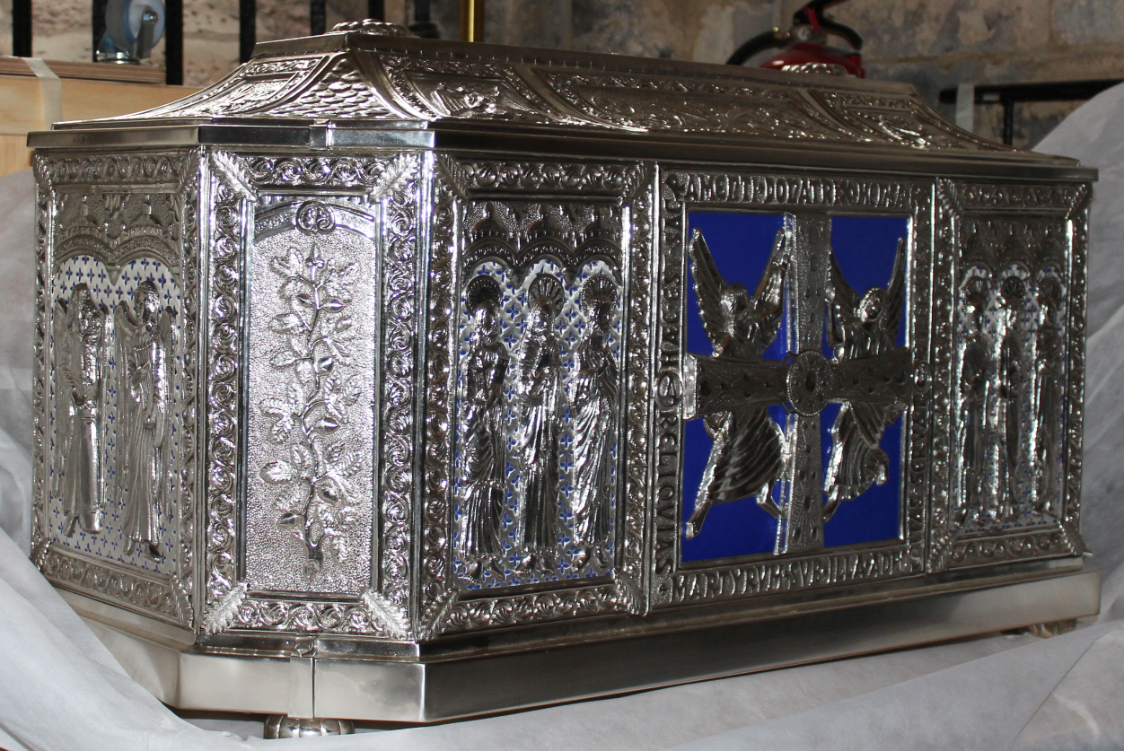 La arqueta que se colocará este domingo bajo el Altar Mayor de la Catedral es obra del taller valenciano Piró Orfebres y fue encargada por el Cabildo hace poco más de un año. Inspirada en el estilo románico y con referencias constantes a Asturias y a la propia Catedral, está realizada con un carácter sobrio y austero, tal y como lo solicitaron los propios canónigos. Cuenta con un apostolado inspirado en las figuras de la Cámara Santa y, en la parte frontal, la Cruz de los Ángeles. Para remarcar la iconografía se usó esmalte azul, en referencia a la ciudad de Oviedo y debido a su peso y a su ubicación bajo el altar se optó por realizar una puerta trasera para poder introducir así las reliquias. En dicha puerta trasera se colocó la figura del Salvador, titular de la Catedral. En los chaflanes del arca, se colocaron ramas de roble y en los laterales, figuras alegóricas de las virtudes.
