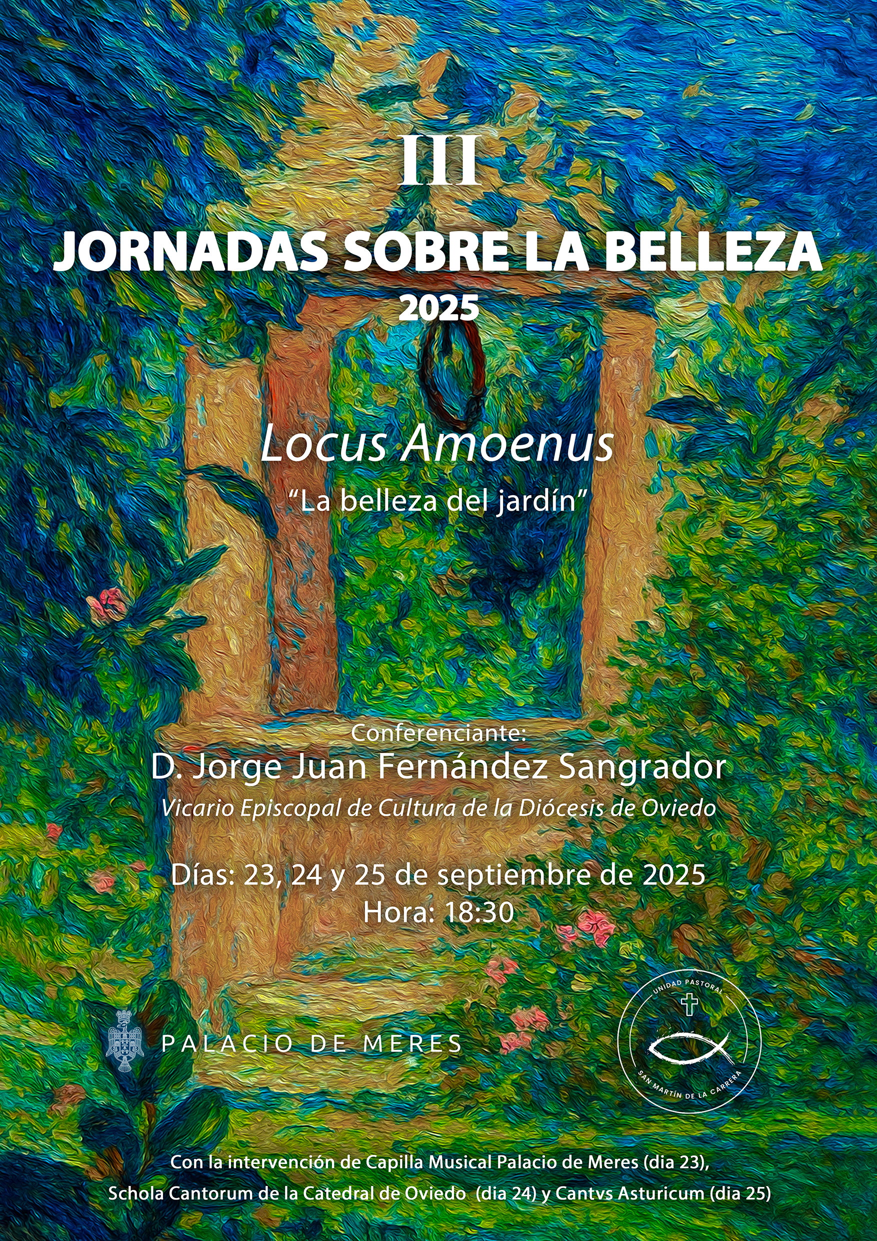 Los próximos martes, miércoles y jueves, 23, 24 y 25 de septiembre, se desarrollarán, a partir de las 18,30 h en la iglesia del Palacio de Meres, las III Jornadas sobre la Belleza, organizadas e impartidas por el Vicario de Cultura de la diócesis, Jorge Juan Fernández Sangrador. En esta ocasión llevan por título «Locus Amoenus. La belleza del jardín» y están abiertas al público hasta completar aforo.