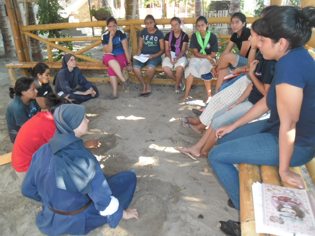 La Hna. Clare, de espaldas, con jóvenes en Ecuador. Al fondo, la Hna. Sara