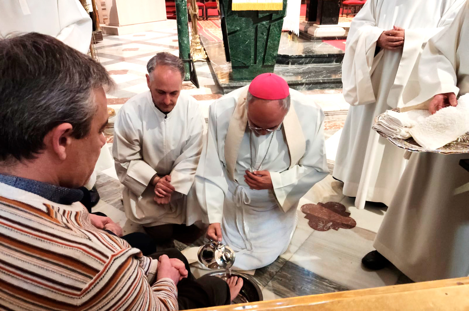 En la eucaristía que rememora la Última Cena y la institución del sacerdocio, tuvo lugar también el gesto del Lavatorio de los Pies, un momento especial que tuvo que ser suprimido durante la pandemia, y que recuerda el gesto de servicio y humildad que tuvo Jesús con sus discípulos. En esta ocasión, como en años anteriores, las personas que participaron en él pertenecían a la Adoración Nocturna Española. En su homilía, Mons. Jesús Sanz quiso recordar que con este acto «el Señor señaló cómo su ministerio se hace servicio concreto, no un postureo prepotente que se aprovecha del cargo para vivir del cuento, y lo expresó con un guiño verdadero al arremangarse y ponerse a lavar los pies cansados de sus amigos, para enseñar en esa parábola viva un ademán ministerial que no gusta de los oropeles vacíos, ni de las pompas extrañas, ni del abuso clericalón de una clase empoderada. Lavar los pies era labor de siervos, menester de esclavos, y eso fue lo que hizo Jesús con cada uno de aquellos discípulos hermanos. Sólo se entiende el sacerdocio como un dejarse partir por amor a los hermanos».